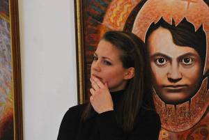 A fotón Bánfi Kata színésznő és Bészabó András Új-hangú Ady festménye.